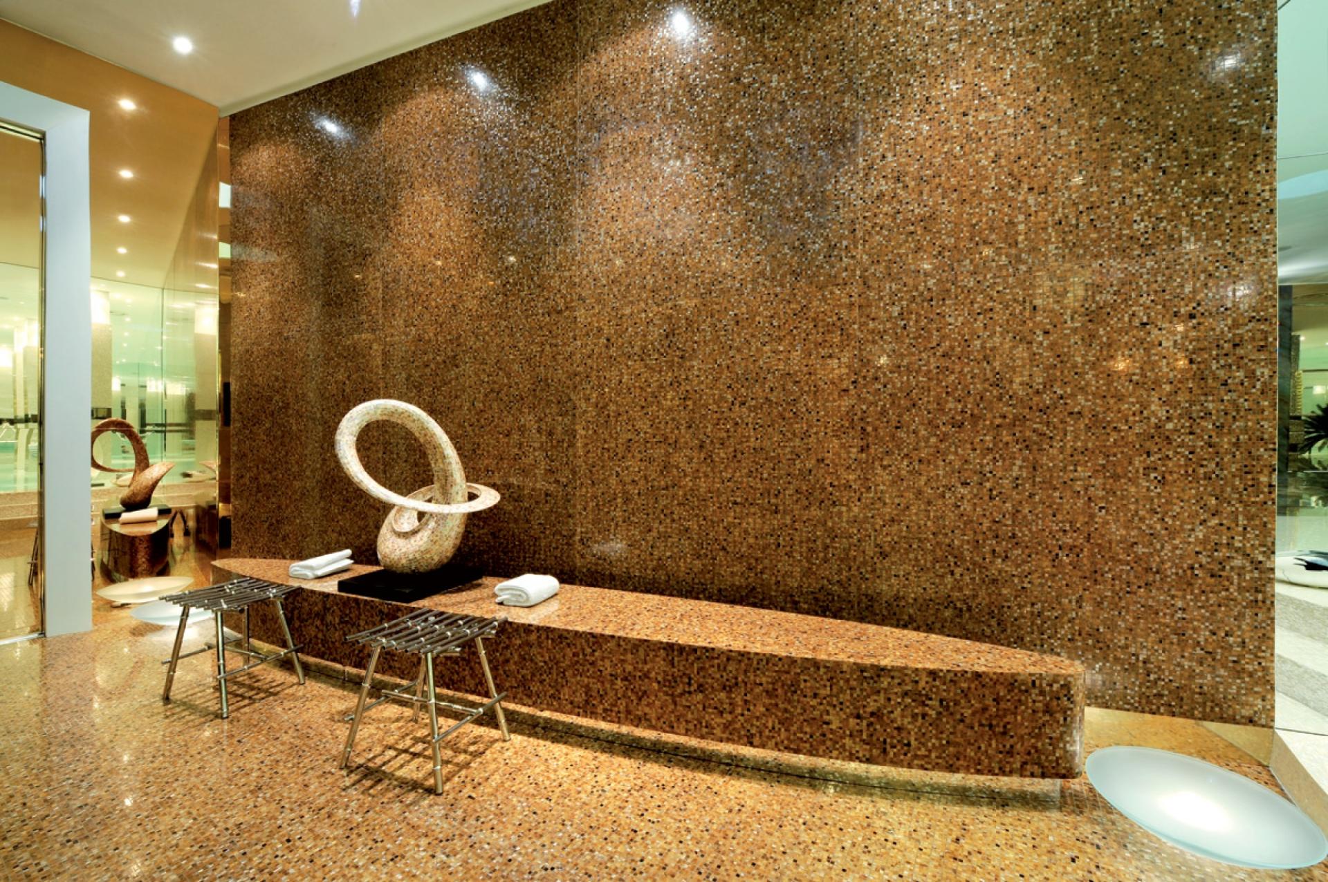 Mur et mobilier de SPA habillés de mosaiques Moka Mother of Pearl