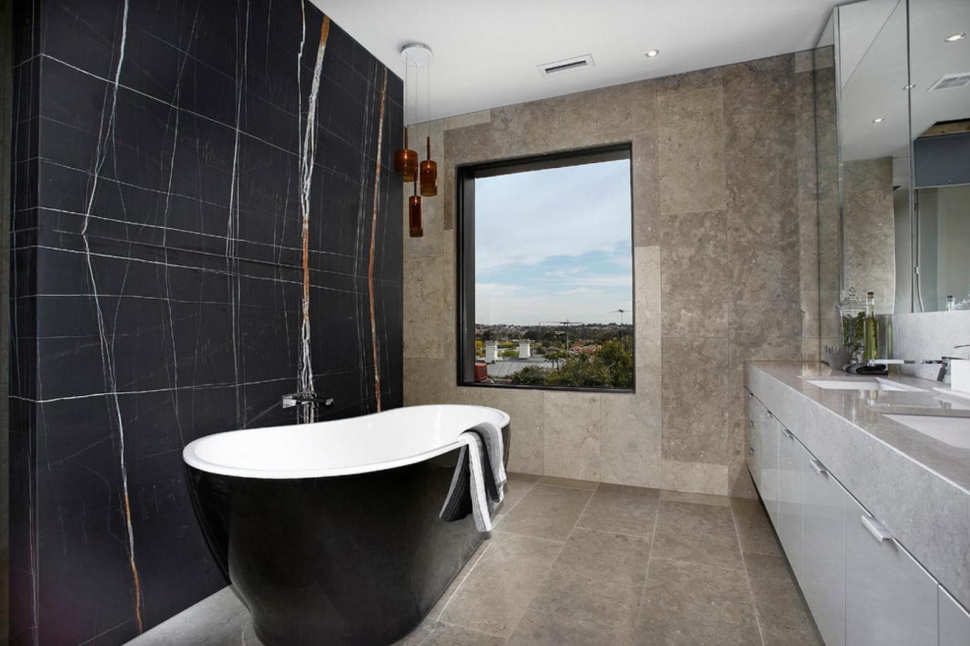 Réalisation d'un revêtement mural en marbre noir Nero Dorato, dans une salle de bains.