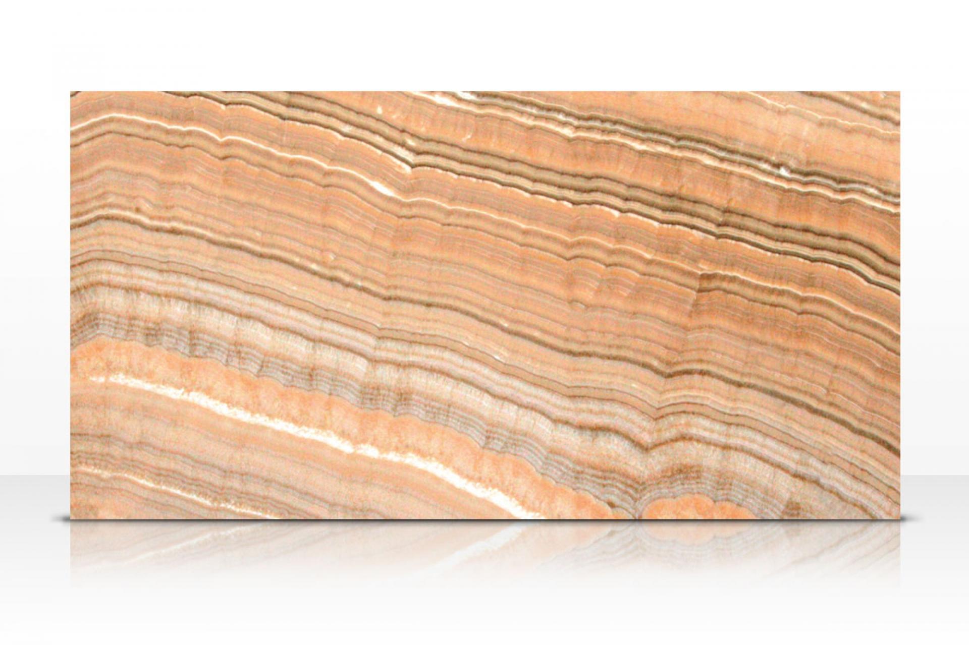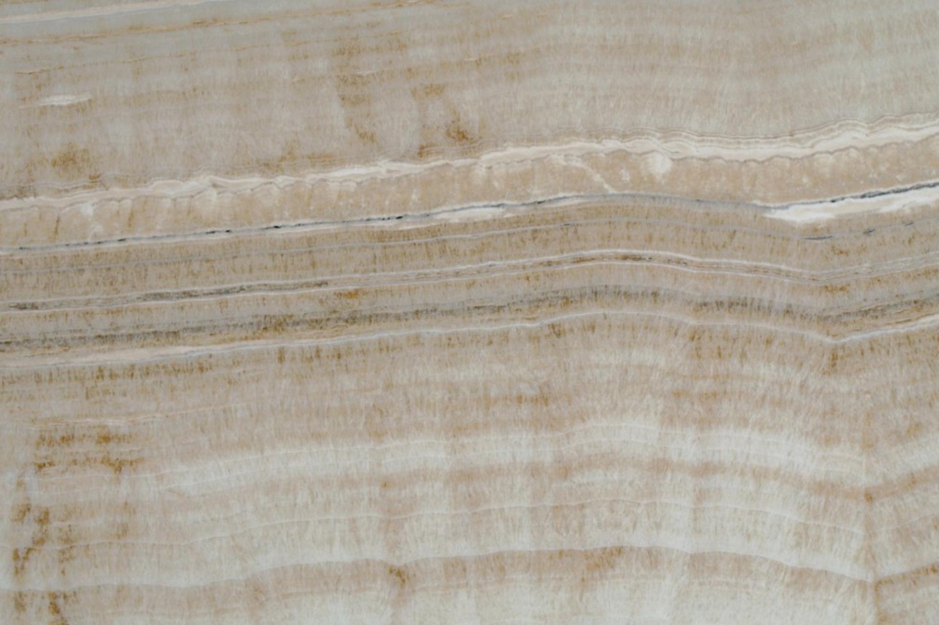 L'Onyx Arco Iris est un onyx d'origine mexicaine de couleur ocre avec des nuances dorées. On peut apercevoir de délicates veines dessinées assez fines ressortant particulièrement lorsque le matériau est rétroéclairé. Cette belle pierre naturelle apporte un rendu précieux et rend une atmosphère chaleureuse.