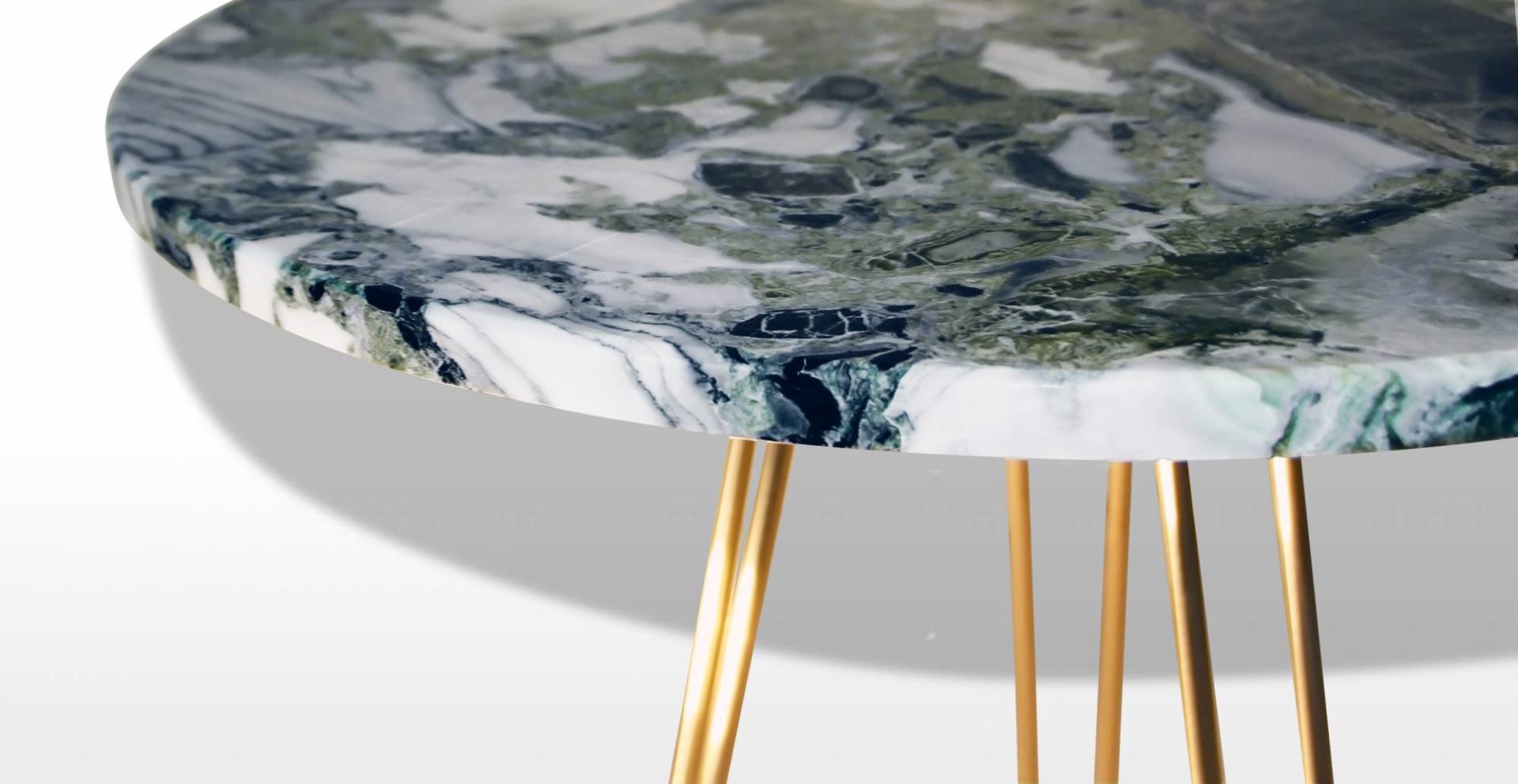 Patty: table basse design vintage en marbre white beauty et pied hairpin legs laiton poli