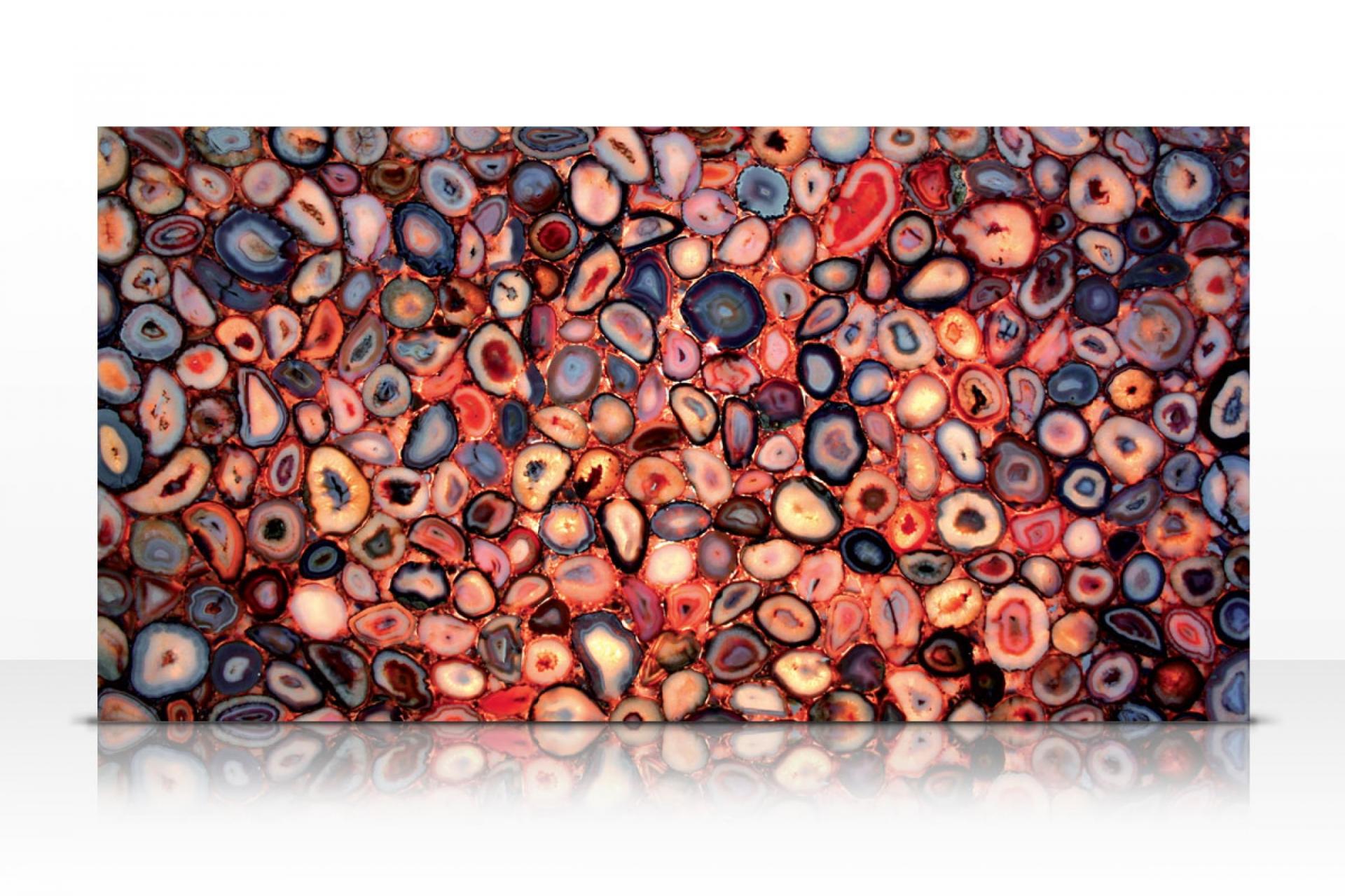 Agate Rouge pierre semi-précieuse rétroéclairable, s'emploie pour rêvetements muraux, agencements intérieurs, salles de bains, cuisines et dallages.