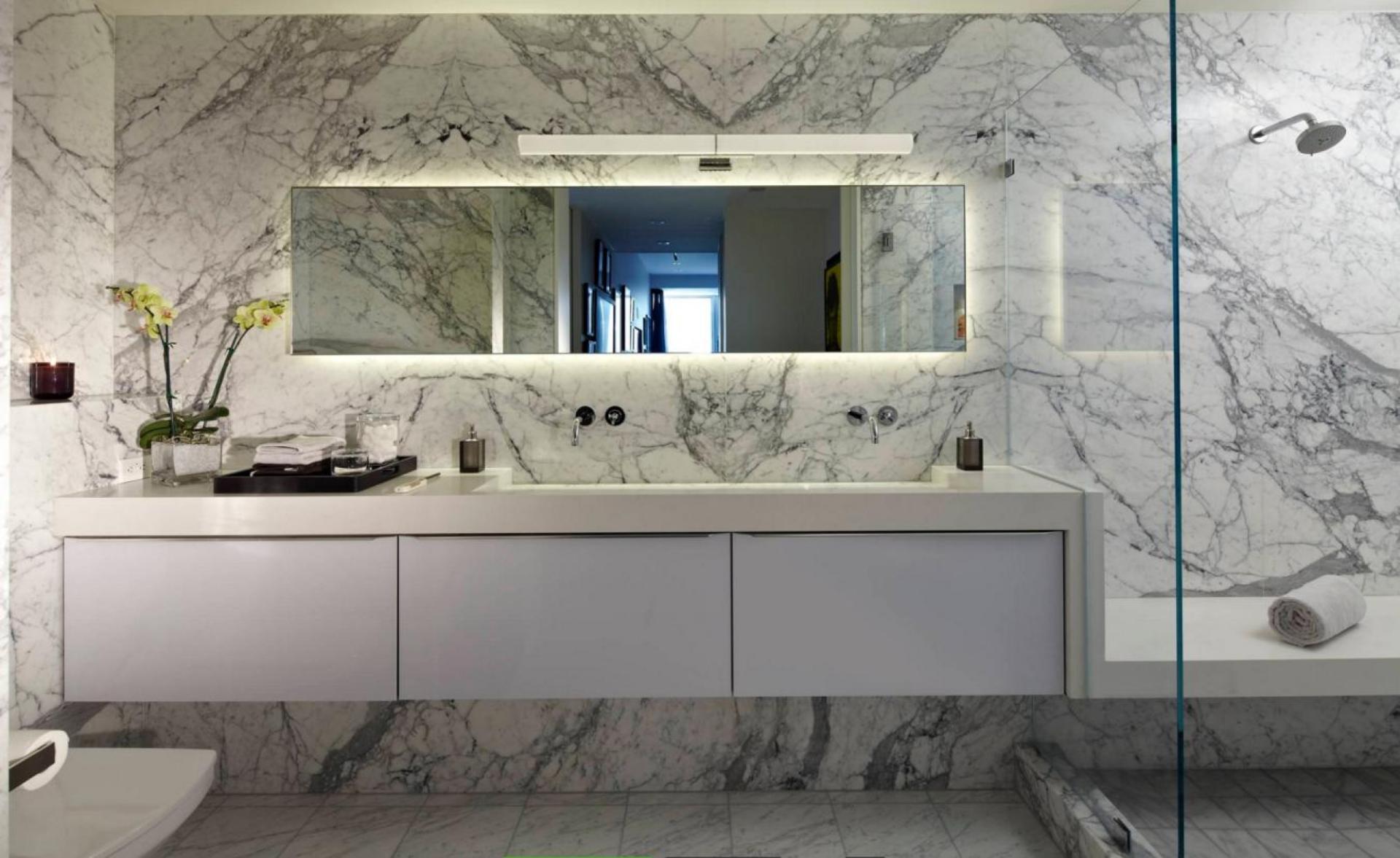 Sur la deuxième photographie nous pouvons voir un revêtement mural en marbre blanc statuaire venato à livre ouvert.