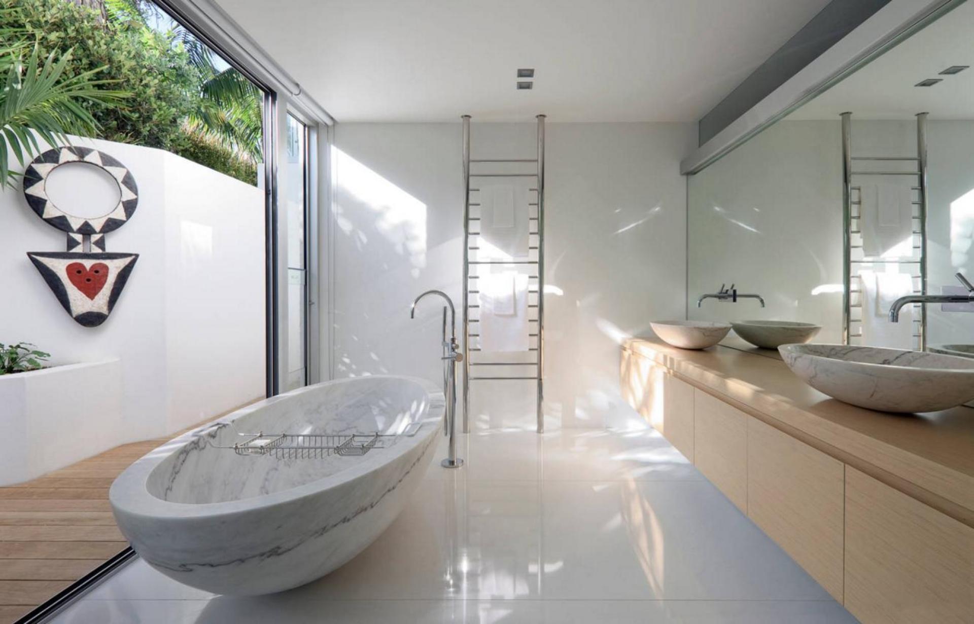 La troisième photographie présente une baignoire et deux vasques massives en marbre blanc statuaire.
