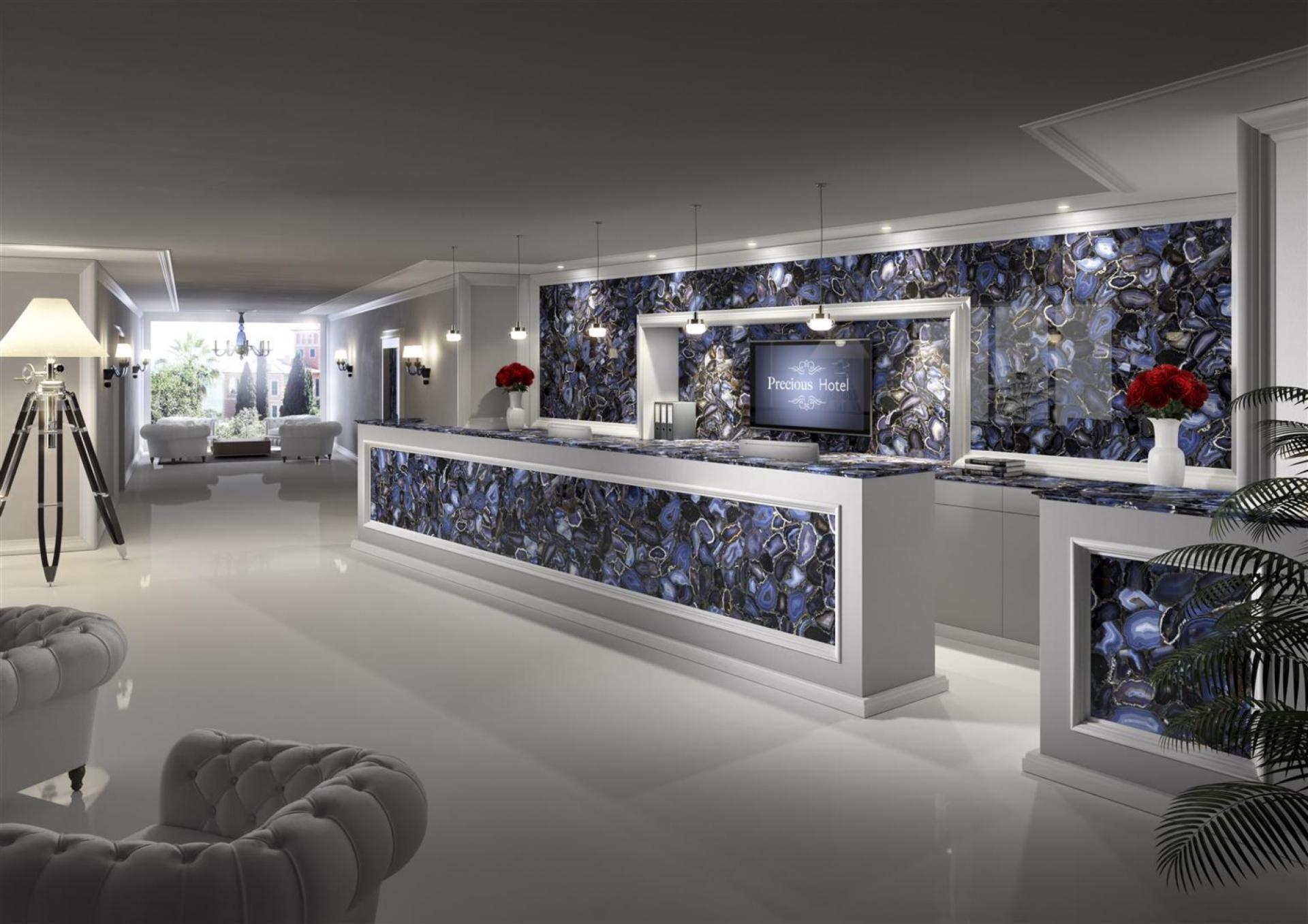 Banque d'accueil, comtoir et panneaux muraux en pierre semi-précieuse Wild Agate Black pour hotel de prestige